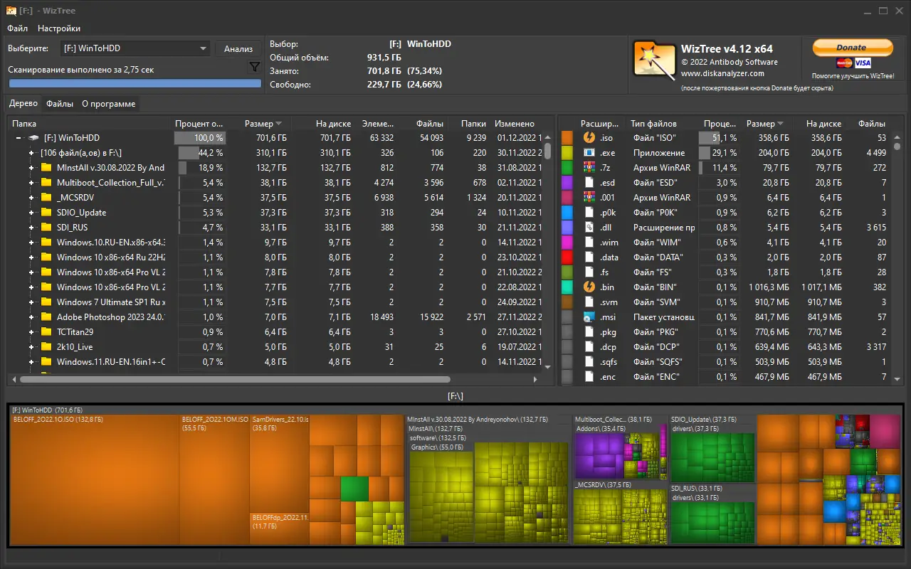 - Программа отображает данные в виде древовидной структуры и интерактивной карты диска (treemap), где размер блоков соответствует объёму занимаемого пространства.