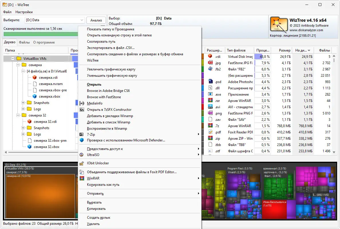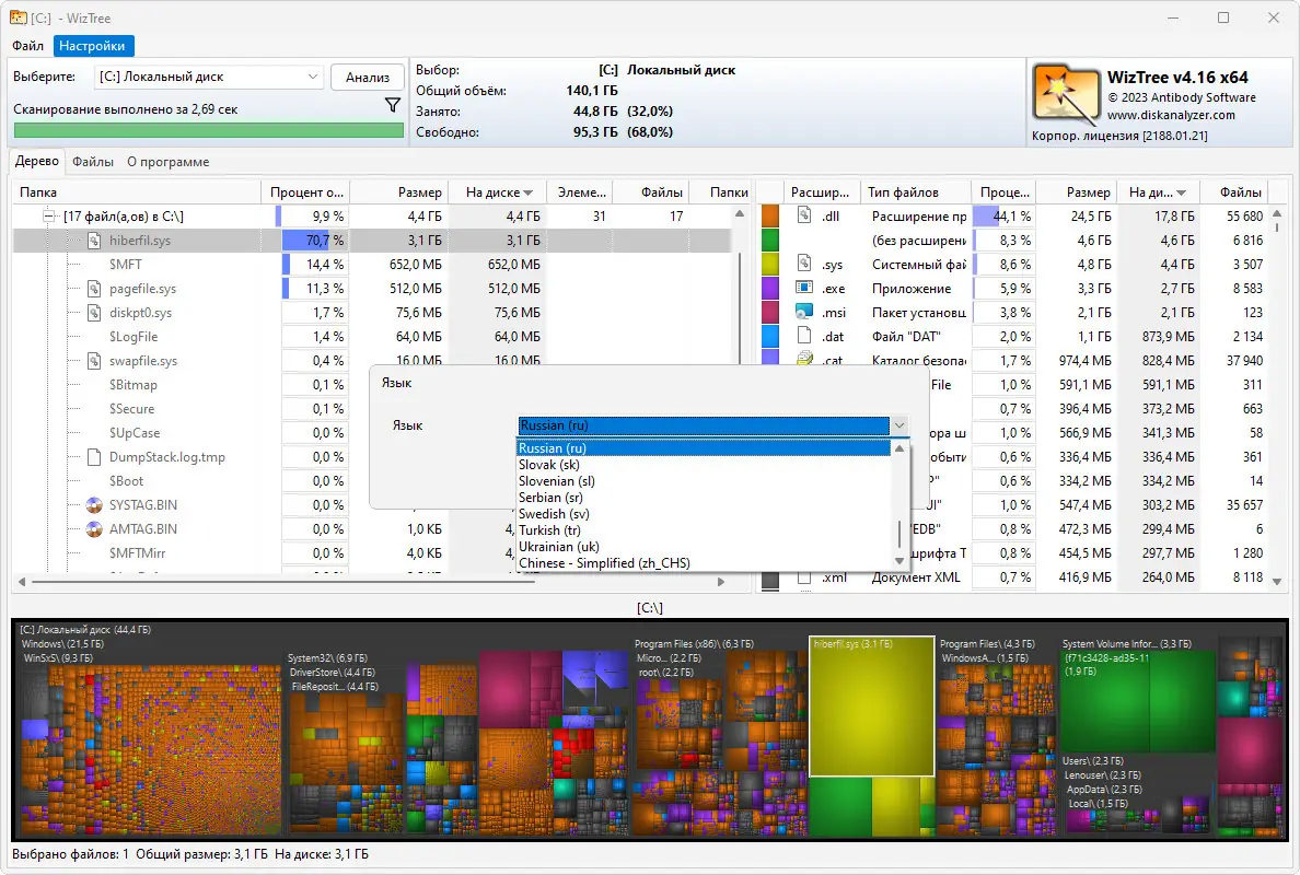 WizTree — это высокоскоростная утилита для анализа занятого места на жёстком диске, позволяющая быстро выявить крупные файлы и папки. Программа работает напрямую с файловой таблицей NTFS, что обеспечивает мгновенное сканирование даже самых объёмных накопителей. Интерфейс интуитивно понятен, а функционал ориентирован на эффективную оптимизацию дискового пространства.