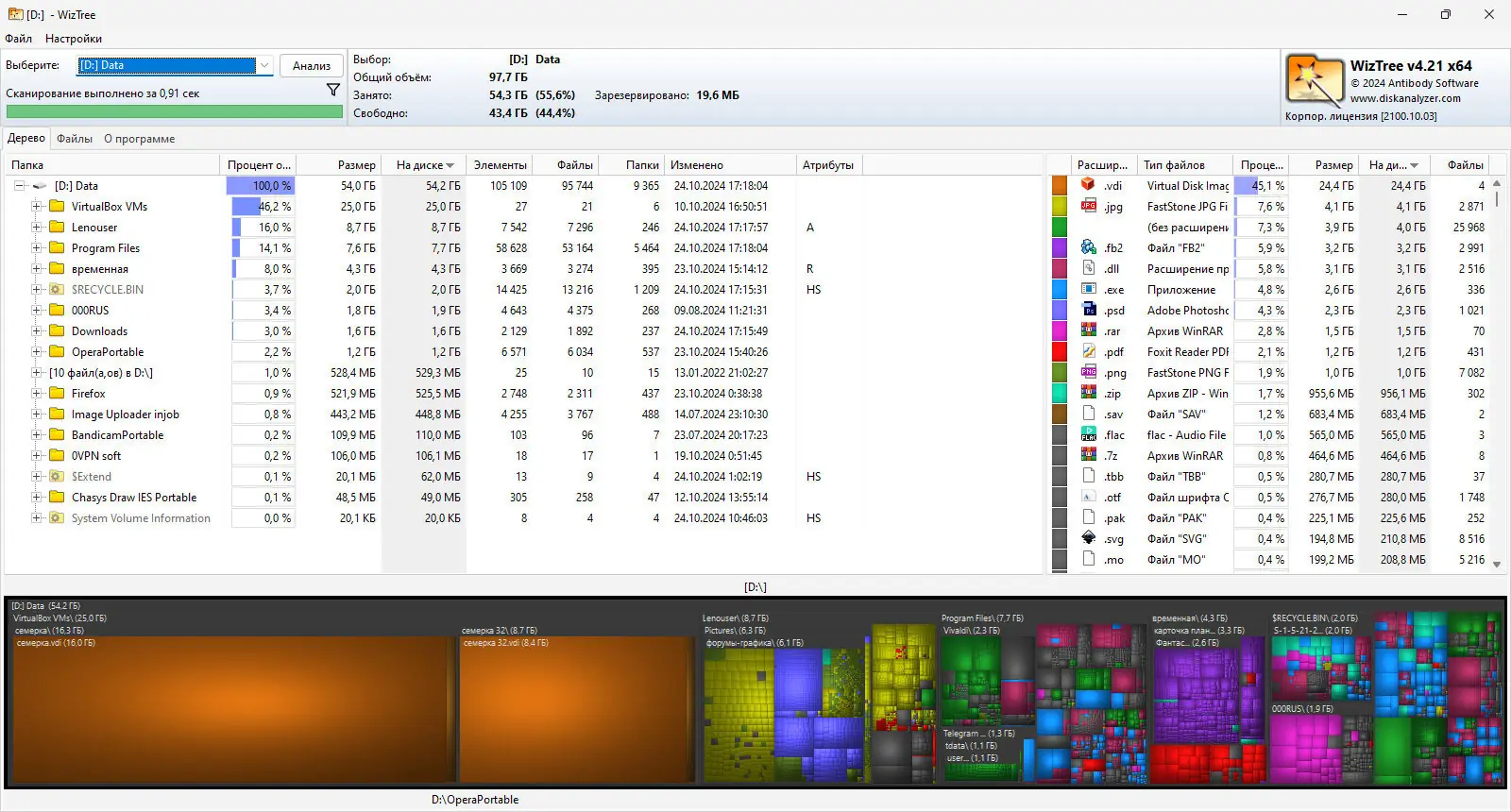 WizTree — это высокоскоростная утилита для анализа дискового пространства, позволяющая быстро выявить файлы и папки, занимающие наибольший объём на жёстком диске. Программа работает напрямую с файловой таблицей NTFS, что обеспечивает мгновенное сканирование даже самых объёмных накопителей. Интерфейс интуитивно понятен, а визуализация данных в виде карты распределения памяти помогает эффективно управлять хранением информации.