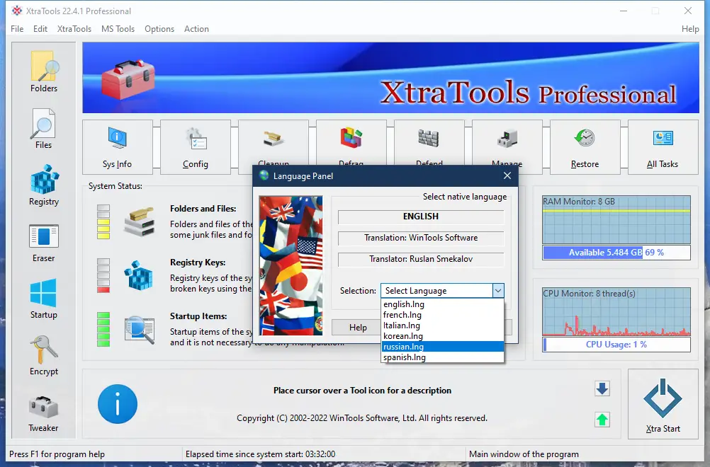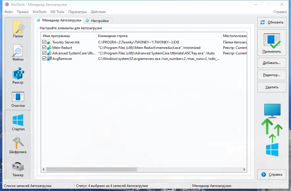 XtraTools — это мощный и многофункциональный набор системных утилит для тонкой настройки и комплексной оптимизации операционной системы Windows. Программа объединяет в себе инструменты для очистки реестра, управления автозагрузкой, шифрования файлов, мониторинга ресурсов и удаления следов активности. Благодаря интуитивному интерфейсу и портативной версии, она подходит как для новичков, так и для опытных пользователей, стремящихся повысить стабильность и производительность своего компьютера.