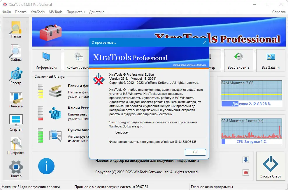 XtraTools представляет собой набор специализированных утилит, каждая из которых решает конкретную задачу по улучшению производительности и безопасности системы. Программа включает в себя такие компоненты, как мониторинг ресурсов, очистка диска и реестра, управление автозагрузкой, удаление следов активности и шифрование файлов. Благодаря модульному принципу работы, пользователь может задействовать только нужные функции, не перегружая систему лишними процессами.