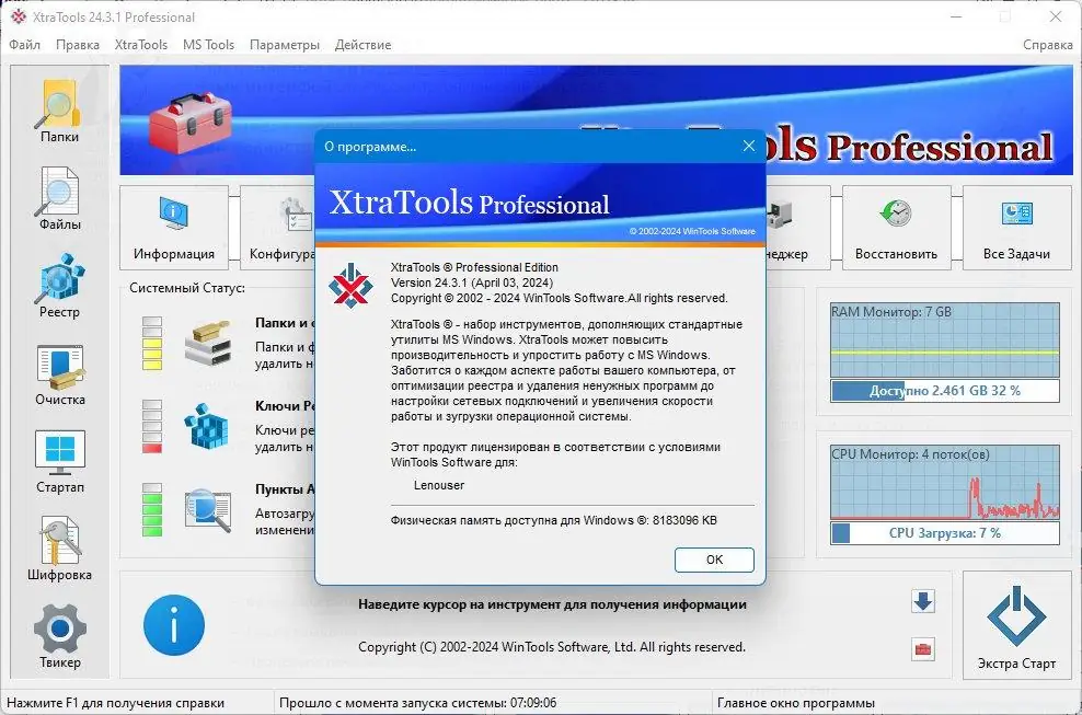 Программа XtraTools доступна для установки на различных версиях Windows, включая 7, 8.1, 10 и 11, как в 32-, так и в 64-битных редакциях. После установки можно активировать расширенные возможности, используя данные из файла key.txt. Решение подойдёт как для домашнего, так и для профессионального использования, обеспечивая стабильную работу системы и защиту личных данных. Версия pro включает дополнительные параметры оптимизации и расширенный контроль над системными процессами.