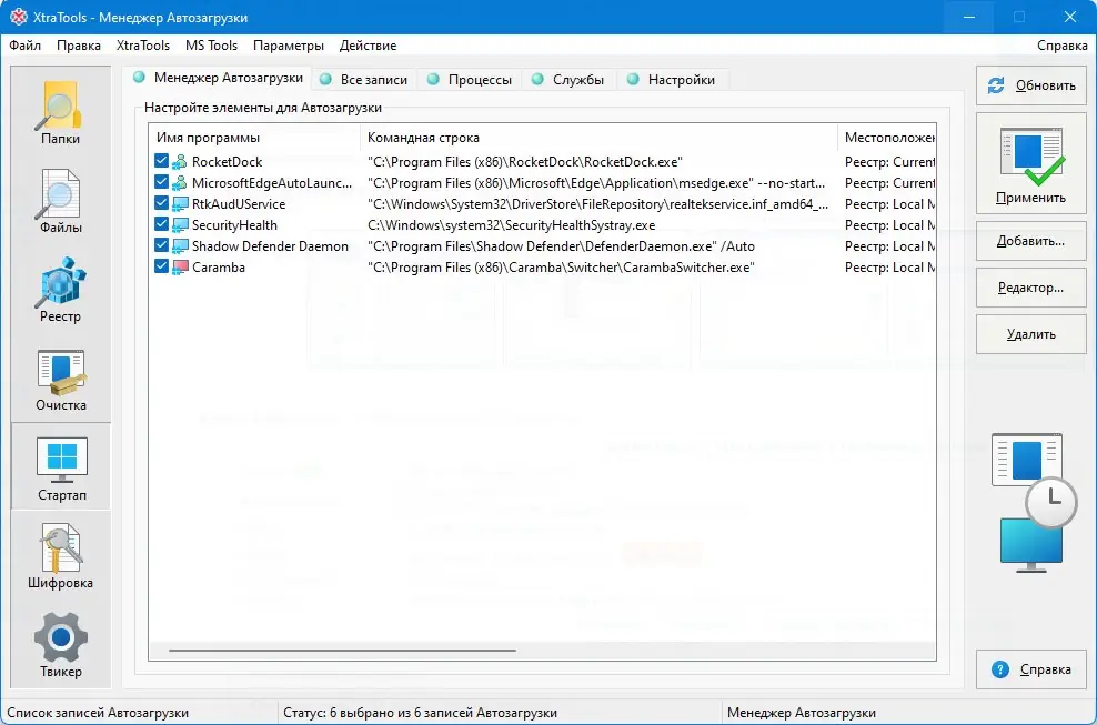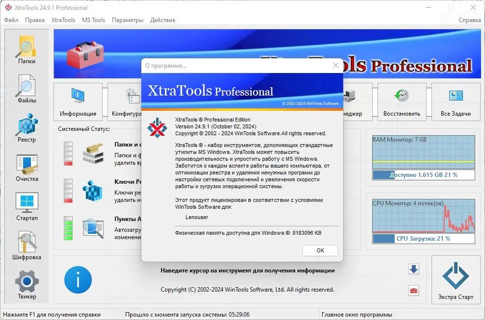 XtraTools — это комплексная утилита для тонкой настройки и оптимизации операционной системы Windows, обеспечивающая стабильную работу компьютера за счёт управления автозагрузкой, очистки реестра, шифрования данных и контроля системных ресурсов. Программа объединяет в себе несколько модулей, каждый из которых решает конкретную задачу по улучшению производительности, безопасности и удобства использования системы. Благодаря компактности и простоте интерфейса, XtraTools подходит как для новичков, так и для опытных пользователей.