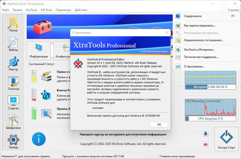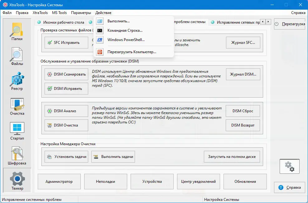 XtraTools — это многофункциональный инструмент для комплексной оптимизации операционной системы Windows, объединяющий в себе средства очистки реестра, управления автозагрузкой, шифрования данных и мониторинга системных ресурсов. Программа помогает ускорить работу компьютера, освободить место на диске и повысить стабильность системы за счёт регулярного обслуживания ключевых компонентов. Её модульная архитектура позволяет точно настраивать каждый аспект производительности без необходимости установки сторонних утилит.