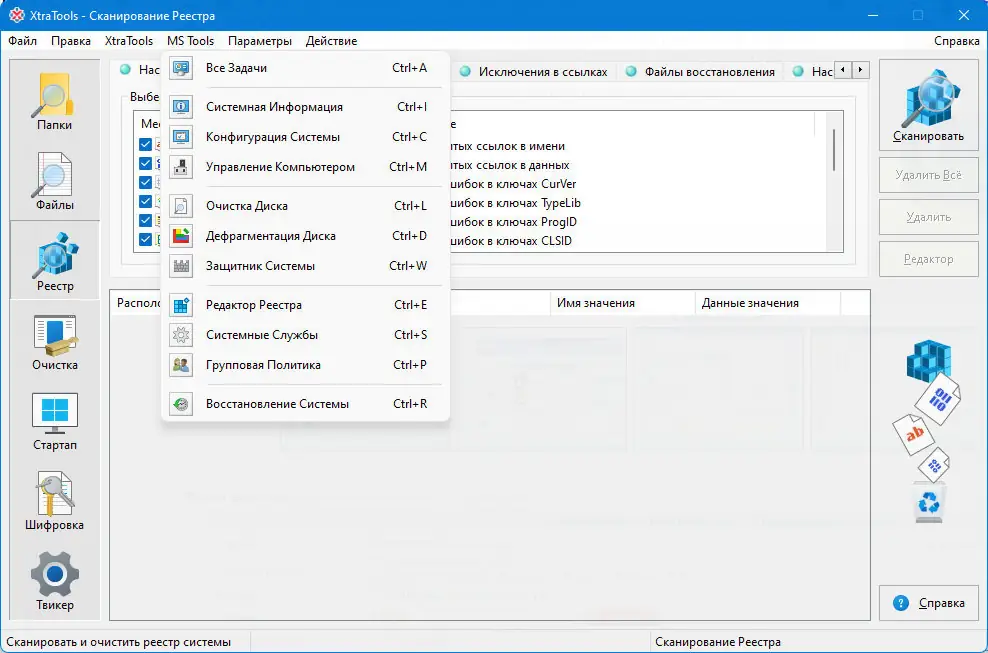 - Средство Scan Registry позволяет проводить глубокую очистку системного реестра, устраняя неверные ссылки и записи от удалённых приложений, что положительно сказывается на скорости загрузки и общей стабильности.