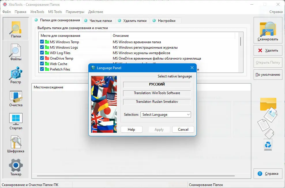 Использование XtraTools не требует специальных технических знаний. После запуска программы пользователь получает доступ к панели с перечнем всех встроенных утилит, каждая из которых сопровождается кратким описанием. Для начала оптимизации достаточно выбрать нужный модуль, запустить сканирование и следовать рекомендациям, предлагаемым интерфейсом. Например, в Startup Manager можно отключить ненужные приложения, запускающиеся вместе с системой, а в Objects Eraser — удалить следы недавней активности, включая историю браузеров и список последних документов. Настройки языка интерфейса меняются через меню Options, где следует выбрать файл russian.lng для полного перевода всех элементов управления.