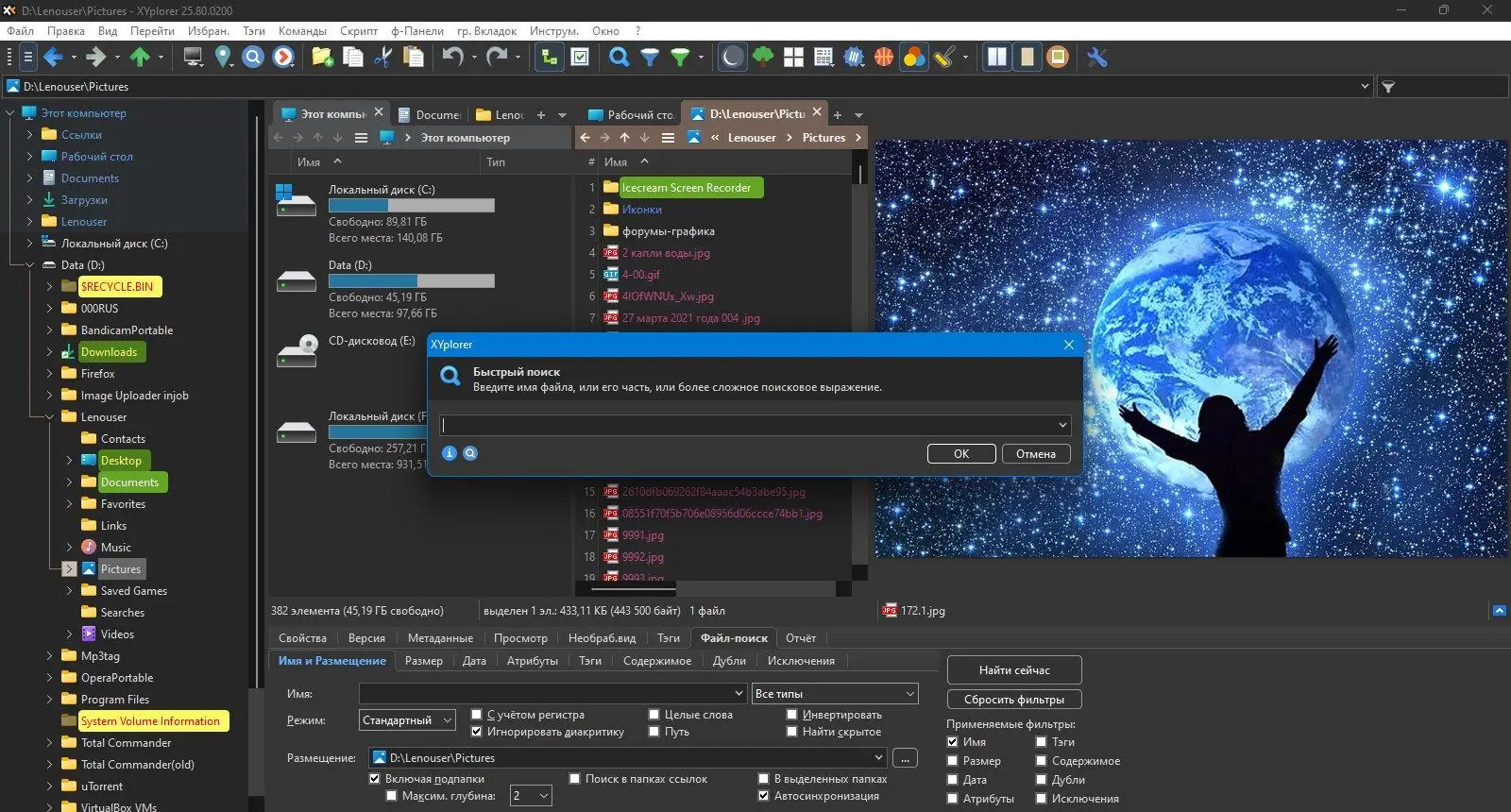 XYplorer предлагает современный подход к управлению файлами, сочетая в себе простоту и расширенные инструменты для опытных пользователей. Интерфейс программы напоминает классический проводник, но с улучшенной навигацией, вкладками, панелями быстрого доступа и расширенными возможностями поиска. Каждое окно можно открыть в отдельной вкладке, что значительно ускоряет переключение между папками и повышает продуктивность.