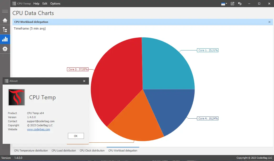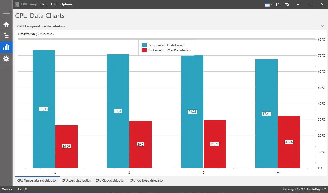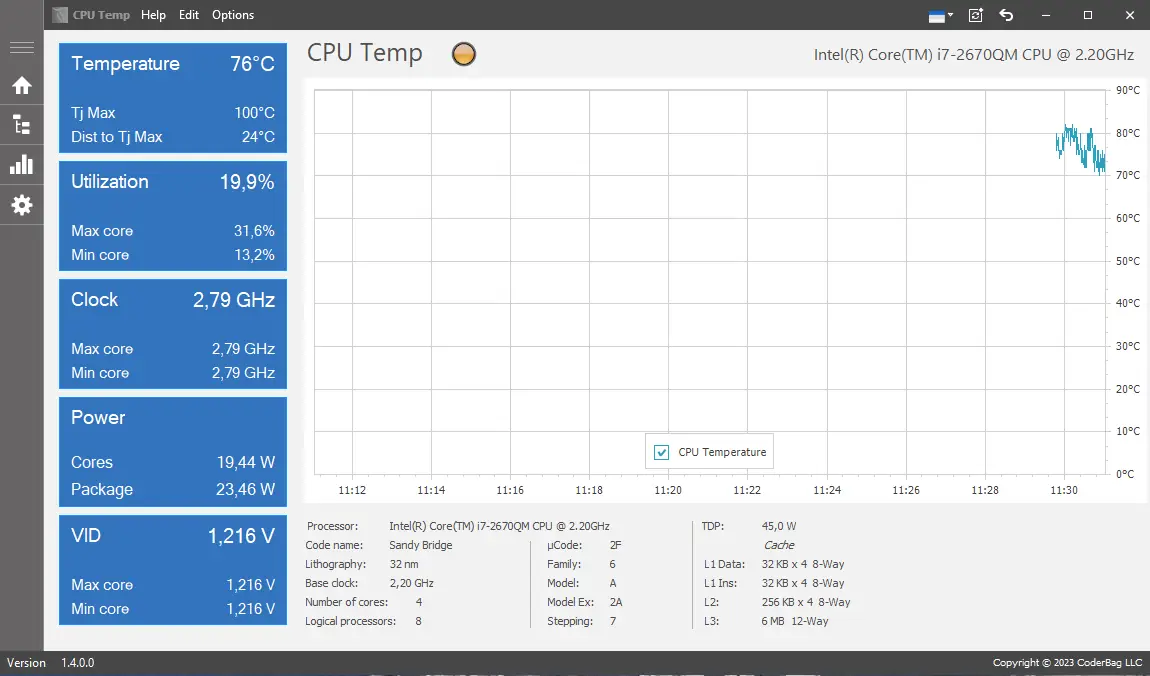 CPU Temp — это инструмент для системного контроля, ориентированный на отслеживание состояния центрального процессора. Программа отображает температуру каждого ядра, текущую загрузку, тактовую частоту, энергопотребление и запрашиваемое напряжение. Интерфейс разделён на функциональные зоны, что упрощает навигацию и восприятие информации. Обновление данных происходит в режиме реального времени, обеспечивая актуальность показаний.