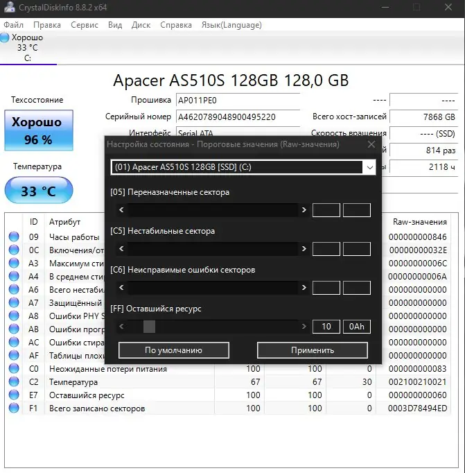 CrystalDiskInfo предоставляет детализированную информацию о каждом подключённом накопителе, включая тип устройства, интерфейс подключения, версию прошивки, серийный номер и общее время наработки. Утилита активно использует данные S.M.A.R.T., анализируя сотни параметров, таких как количество циклов включения, состояние буфера, уровень ошибок при чтении и записи, а также статистику по перенастройке секторов. Это позволяет оценить текущее «здоровье» диска и спрогнозировать его оставшийся срок службы.