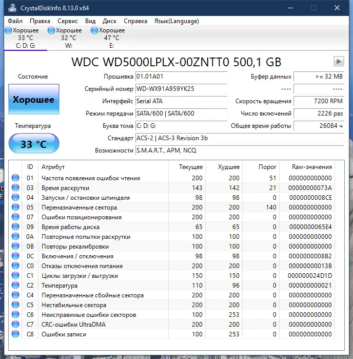 После запуска CrystalDiskInfo автоматически определяет все подключённые накопители и отображает их в главном окне. Каждое устройство сопровождается цветовой индикацией: зелёный — всё в порядке, жёлтый — есть предупреждения, красный — высокий риск отказа. Чтобы как проверить состояние диска, достаточно изучить список атрибутов S.M.A.R.T. и обратить внимание на строки с низким значением «Текущее» или высоким «Смещение».