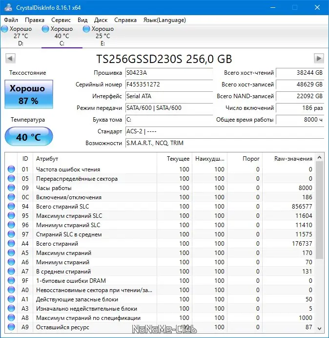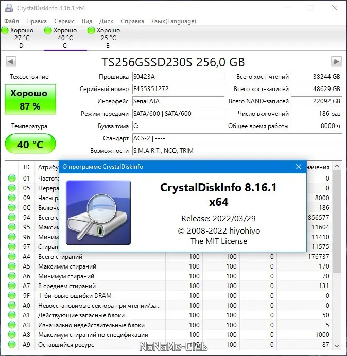 - Отображение текущего состояния здоровья диска — от «Хорошо» до «Сбой»