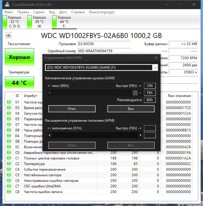 После запуска приложение автоматически определяет все подключённые диски и начинает их анализ. В главном окне отображается таблица с основными атрибутами S.M.A.R.T., где каждый параметр сопровождается текущим значением и пороговым уровнем. Пользователь может открыть вкладку «График», чтобы визуально оценить динамику изменения температуры или других показателей. Для настройки оповещений используется раздел «Функции», где можно задать действия при обнаружении аномалий, например, отправку уведомления или выключение компьютера. Также доступна регулировка акустических характеристик через управление AAM и APM, что особенно полезно для внешних устройств.