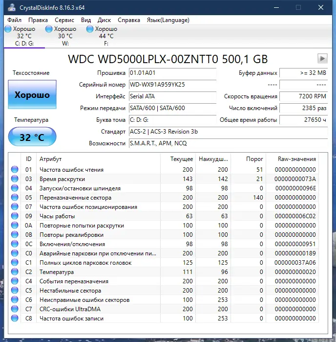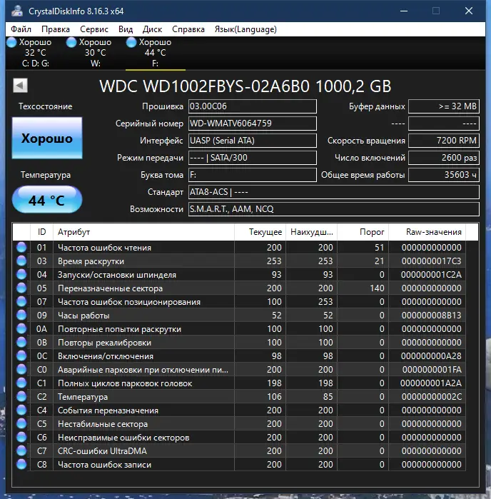 CrystalDiskInfo предоставляет детальную информацию о подключённых накопителях, включая модели, серийные номера, интерфейсы подключения и версии прошивки. Утилита поддерживает как внутренние, так и внешние устройства, в том числе подключённые через USB и IEEE 1394. Это делает её универсальным решением для диагностики состояния дисков в различных конфигурациях.