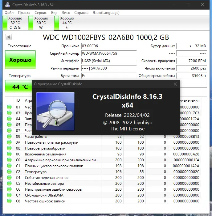 CrystalDiskInfo — это утилита для мониторинга состояния жёстких дисков и твердотельных накопителей, поддерживающих технологию S.M.A.R.T. Программа анализирует параметры диска, оценивает его работоспособность и предупреждает о потенциальных сбоях. Она отображает температуру, время наработки, количество циклов включения и другую техническую информацию.