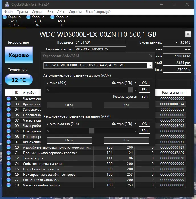 - Управление режимами AAM (акустическое управление) и APM (управление питанием) для совместимых устройств.