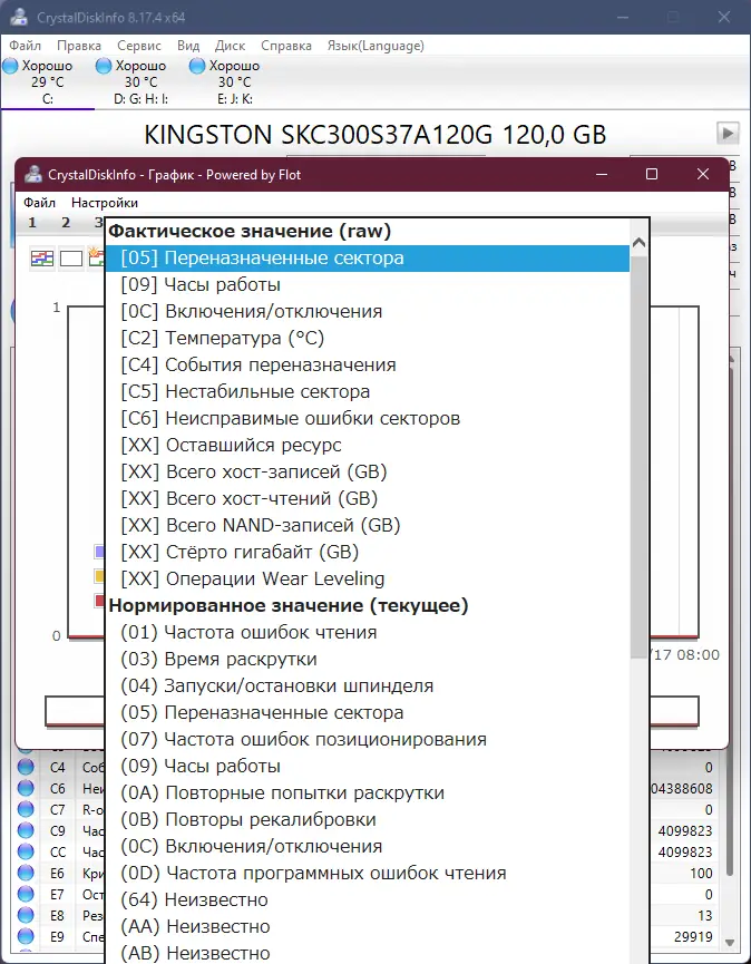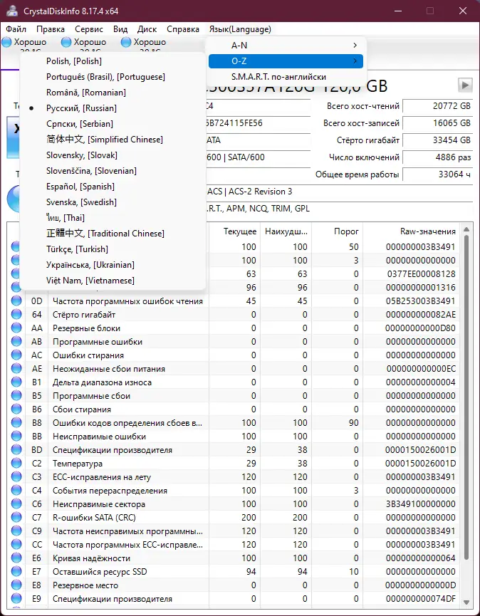CrystalDiskInfo позволяет в режиме реального времени отслеживать состояние накопителей, подключённых к системе. Утилита считывает данные S.M.A.R.T., включая количество циклов включения, ошибки чтения, износ ячеек у ssd, температурные показатели и статистику работы шпинделя. Интерфейс отображает не только общую оценку, но и детализацию по каждому параметру, что помогает заранее выявить потенциальные сбои.