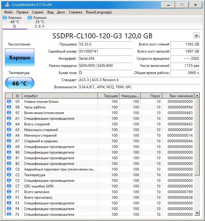 CrystalDiskInfo предоставляет детальную информацию о подключённых внутренних и внешних дисках, включая модель, серийный номер, объём кэша, интерфейс подключения и версию прошивки. Утилита считывает данные S.M.A.R.T., анализируя сотни параметров, таких как количество перезагрузок, ошибки чтения секторов, уровень шума и износ ячеек в случае с ssd. Это позволяет оценить реальное состояние накопителя и предотвратить потерю данных из-за внезапного отказа.
