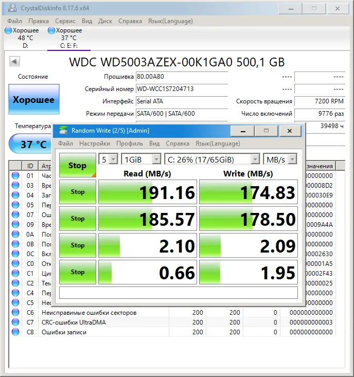 После запуска приложение автоматически определяет все подключённые накопители и выводит информацию в удобной таблице. Пользователь может просмотреть детали каждого устройства: модель, объём, интерфейс подключения, версию прошивки и серийный номер. Для диагностики состояния диска можно открыть вкладку S.M.A.R.T., где отображаются все ключевые параметры, такие как количество перезагрузок, ошибки чтения, время позиционирования головок и уровень износа ячеек у SSD.