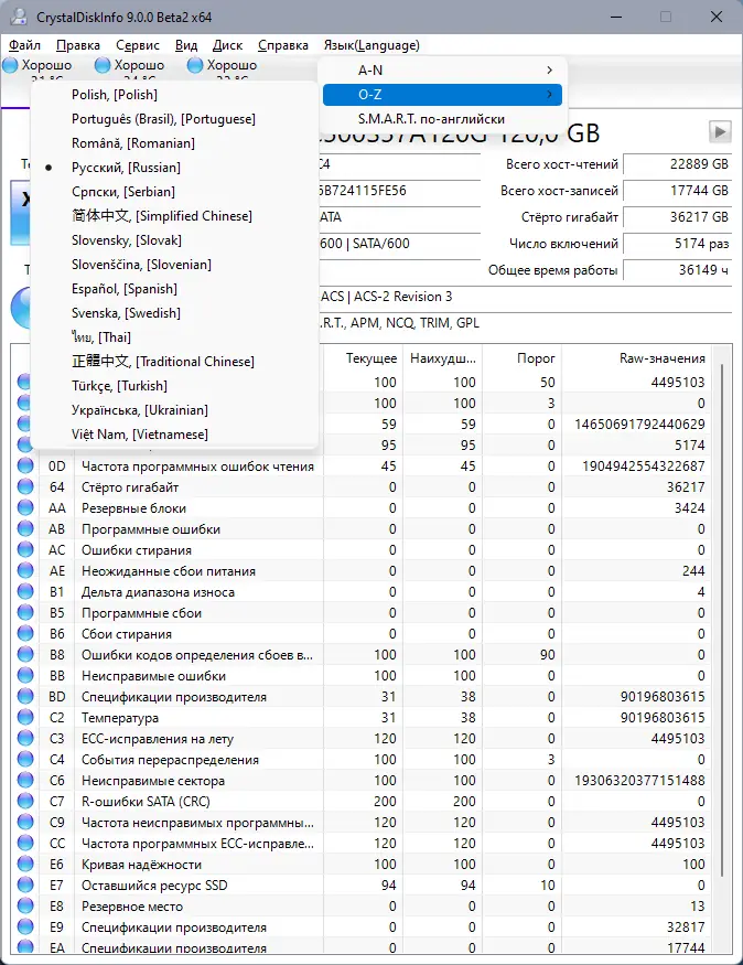 Интерфейс CrystalDiskInfo интуитивно понятен и не требует специальных знаний. После запуска программа автоматически определяет все подключённые накопители и выводит их основные характеристики. Пользователь может переключаться между дисками, просматривать детализированные параметры, такие как количество циклов включения, время наработки, уровень износа SSD и ошибки чтения/записи.