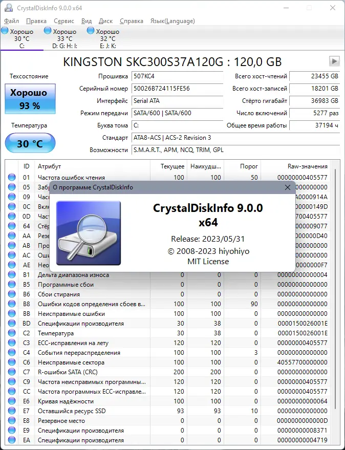 После запуска приложение автоматически сканирует систему и отображает список всех обнаруженных накопителей. Пользователь видит основные параметры: модель, объём, интерфейс подключения, версию прошивки и серийный номер. В нижней части окна выводятся атрибуты S.M.A.R.T. с расшифровкой каждого показателя и текущим значением.