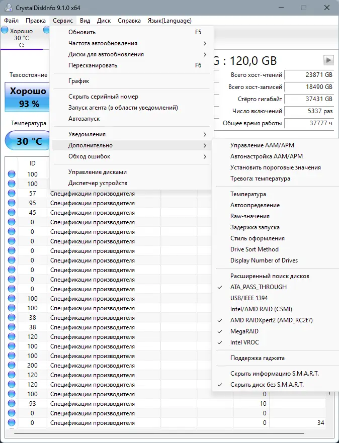 - Отображение температуры, модели, объёма и времени наработки дисков.