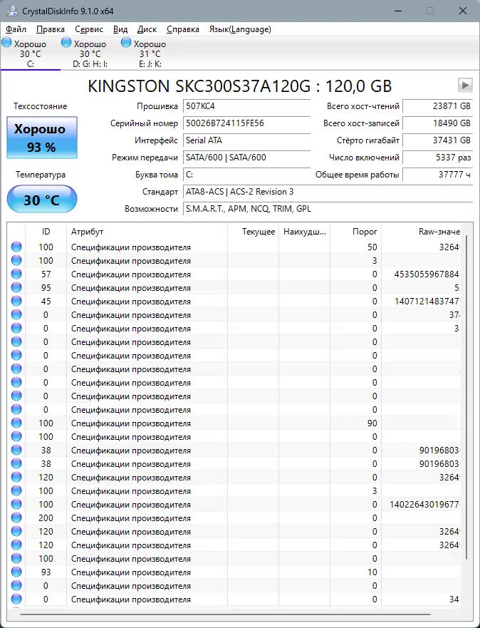 CrystalDiskInfo предоставляет пользователям полный контроль над состоянием накопителей, установленных в системе. Программа считывает данные S.M.A.R.T., анализирует их и выставляет общую оценку «здоровья» каждого диска. Это особенно важно при работе с стареющими HDD или активно используемыми ssd, где износ может привести к внезапному выходу из строя.