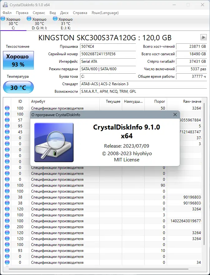 CrystalDiskInfo — это инструмент для мониторинга состояния жёстких дисков и твердотельных накопителей, поддерживающих технологию S.M.A.R.T. Программа отображает детальную информацию о подключённых дисках, включая температуру, время работы, а также критические параметры, влияющие на долговечность. Она помогает вовремя выявить потенциальные неисправности и предотвратить потерю данных.