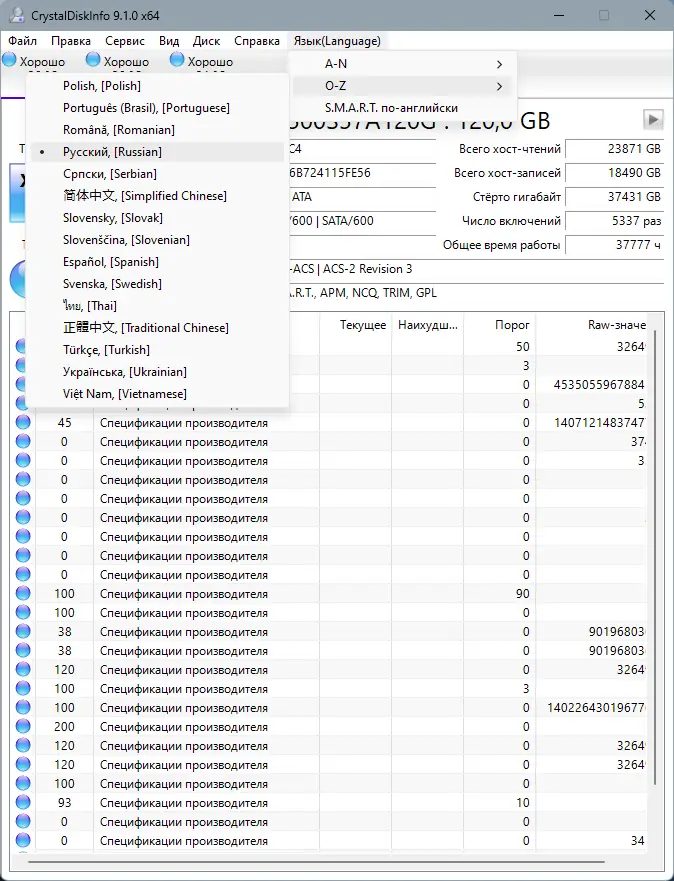 После запуска CrystalDiskInfo пользователь видит список всех подключённых накопителей с краткой сводкой по каждому. Основной экран показывает температуру, статус здоровья, а также детализацию по каждому из S.M.A.R.T.-атрибутов. Графики в нижней части окна отражают динамику изменения ключевых показателей, таких как температура или количество перезагрузок.