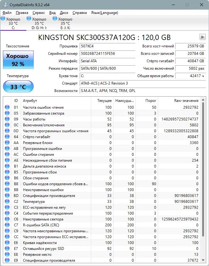 CrystalDiskInfo предоставляет пользователям точные данные о текущем состоянии всех подключённых накопителей, включая HDD и SSD. Утилита считывает и интерпретирует атрибуты S.M.A.R.T., позволяя вовремя выявить признаки износа или нестабильной работы диска. Это помогает предотвратить потерю данных за счёт раннего оповещения о потенциальных сбоях.