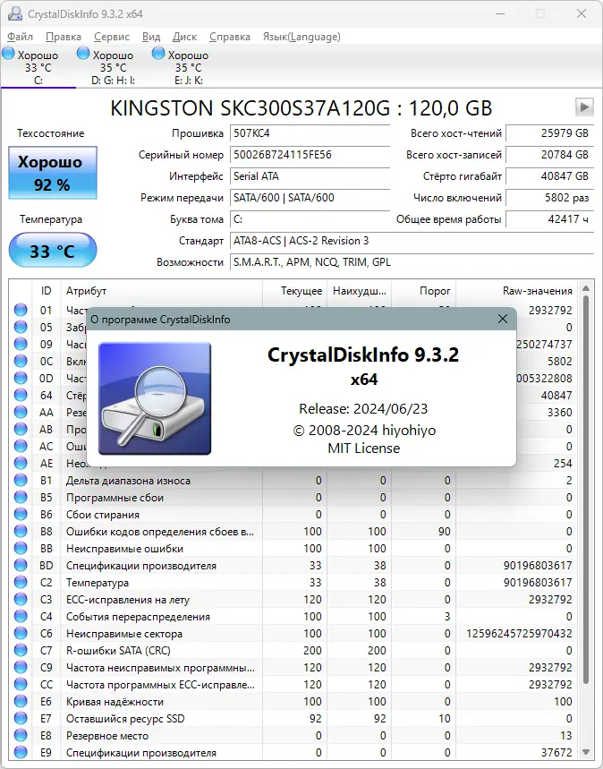 CrystalDiskInfo — утилита для мониторинга состояния жёстких дисков и твердотельных накопителей, использующая технологию S.M.A.R.T. для оценки работоспособности и прогнозирования возможных сбоев. Программа отображает детальную информацию о температуре, ресурсе, производительности и ключевых параметрах накопителей. Поддерживает внутренние и внешние устройства, включая подключение через USB и IEEE 1394.