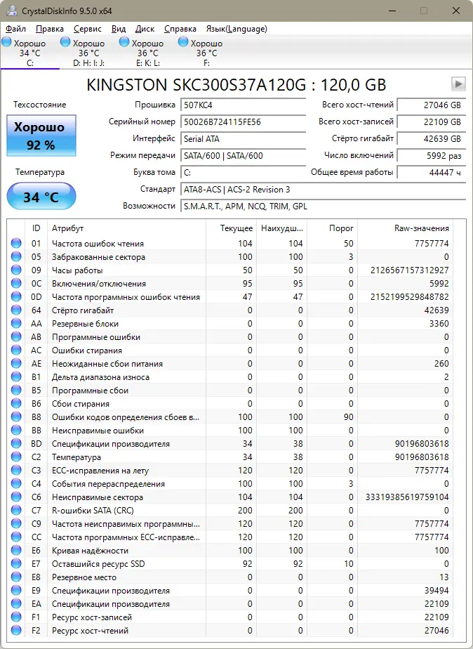 CrystalDiskInfo отслеживает ключевые параметры дисковых устройств, включая HDD и ssd, анализируя данные S.M.A.R.T. для оценки их работоспособности. Утилита отображает технические характеристики каждого накопителя: модель, серийный номер, объём, интерфейс подключения, версию прошивки и общее время наработки. Особое внимание уделяется температурным показателям, которые напрямую влияют на долговечность оборудования.
