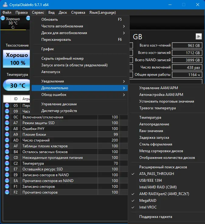 - Поддержка ssd и HDD с детальной информацией по S.M.A.R.T.