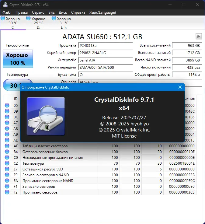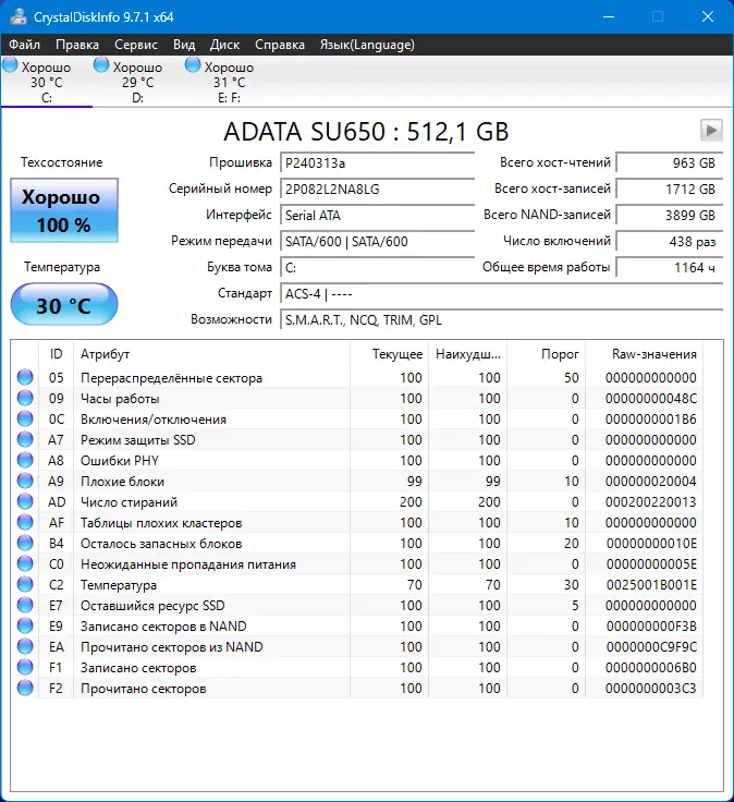 CrystalDiskInfo отслеживает ключевые показатели работы накопителей, включая как классические HDD, так и современные ssd. Программа считывает данные S.M.A.R.T., анализирует их и выводит общую оценку состояния диска — от «Хорошее» до «Сбой». Пользователь видит текущую температуру, ресурс износа, количество перезагрузок, а также предупреждения о критических отклонениях в работе.