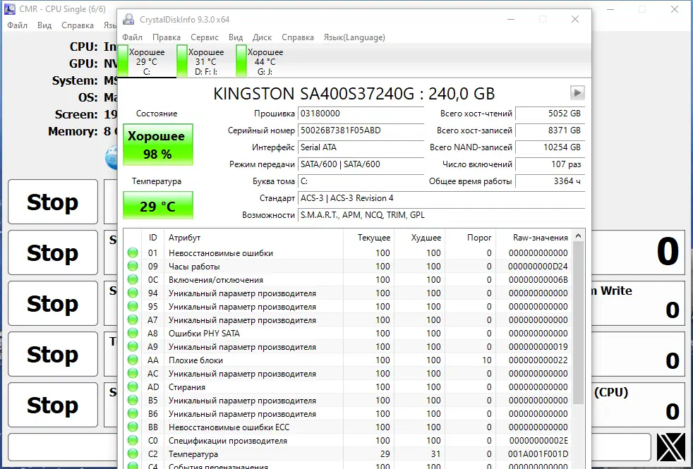 CrystalDiskInfo предоставляет детальный анализ состояния всех подключённых накопителей, включая внутренние и внешние устройства. Утилита поддерживает широкий спектр интерфейсов, таких как SATA, IDE, SCSI, USB и IEEE 1394, что делает её универсальным решением для различных конфигураций. Программа анализирует атрибуты S.M.A.R.T., такие как количество перезагрузок, ошибки чтения секторов, износ SSD и уровень физического износа механических дисков.