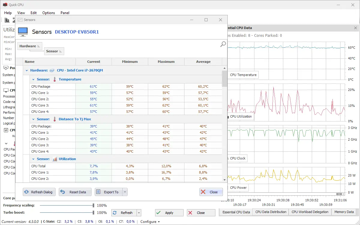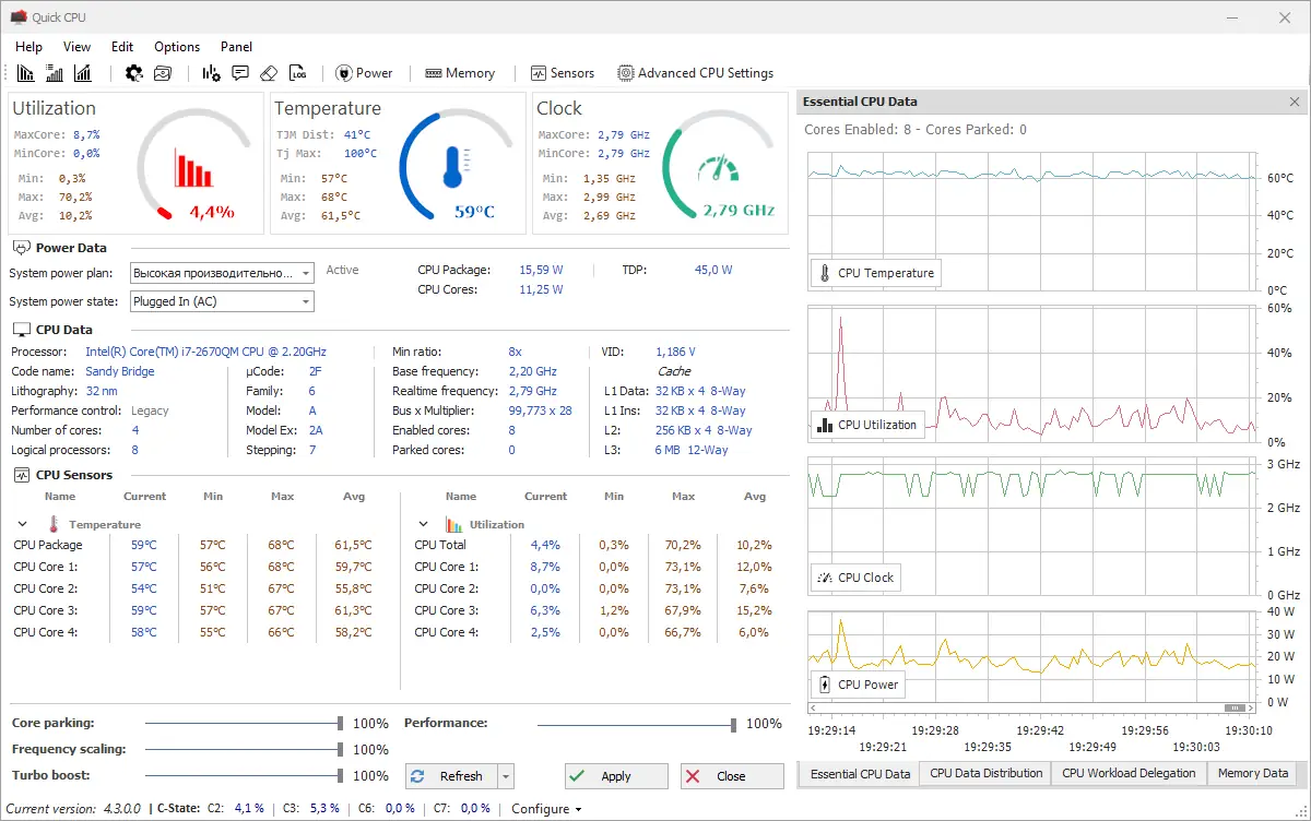 QuickCPU представляет собой мощное решение для мониторинга и управления производительностью процессора в реальном времени. Приложение поддерживает широкий спектр функций, включая контроль над масштабированием частот, технологией Turbo Boost, состояниями C-State и Speed Shift. Пользователи могут отслеживать температуру ядер, уровень загрузки каждого ядра, а также состояние энергосбережения и напряжения через встроенные графики и индикаторы.