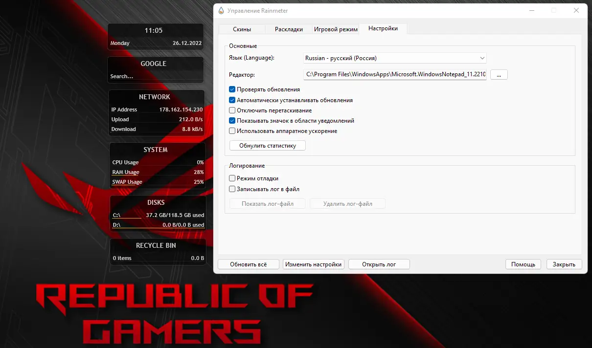 Rainmeter предоставляет пользователям широкие возможности для отображения данных о состоянии системы на экране. Программа работает с различными источниками информации, включая процессор, оперативную и виртуальную память, дисковые накопители и сетевые подключения. Каждый элемент отображается в виде минималистичного виджета, который можно свободно перемещать, изменять и интегрировать в общий дизайн рабочего стола.