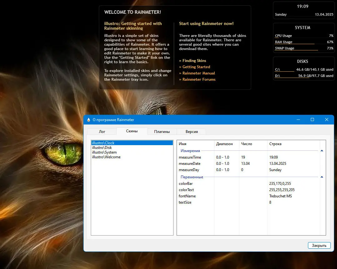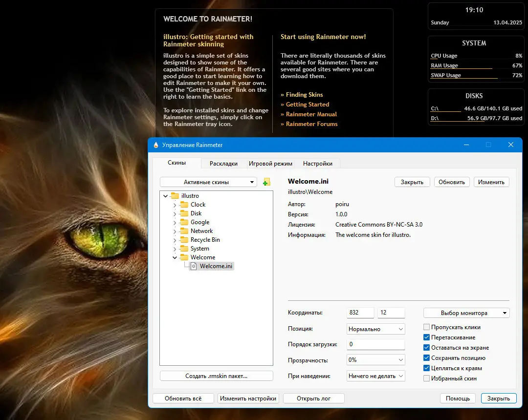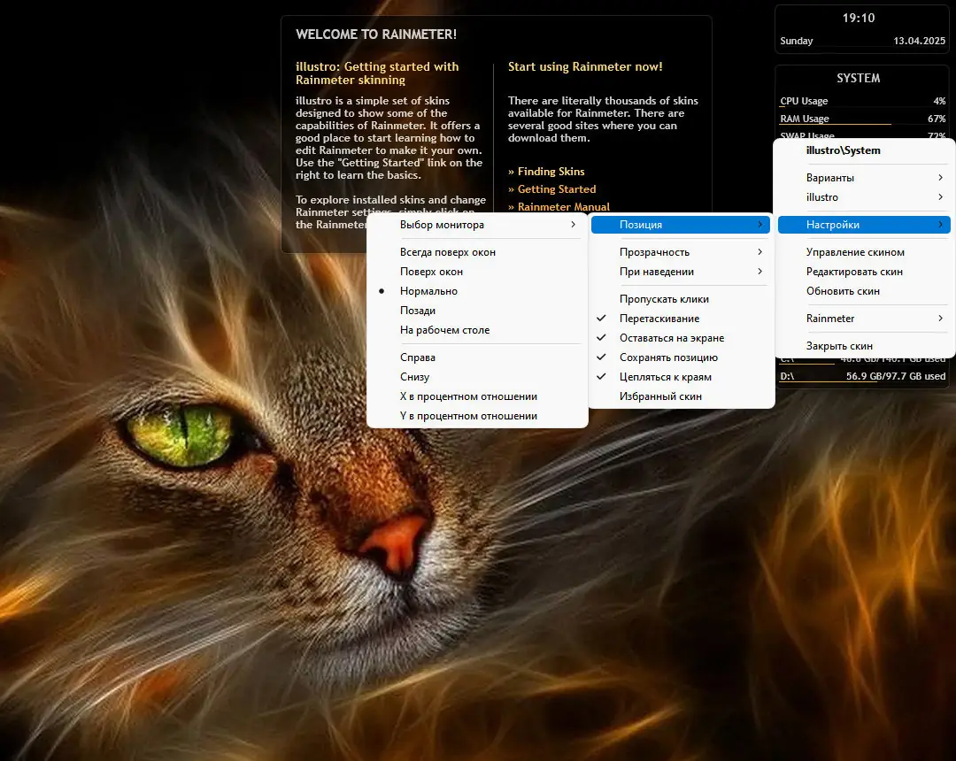 После установки Rainmeter на рабочем столе появляются стандартные виджеты, отображающие основные параметры системы. Пользователь может открыть менеджер скинов, чтобы добавить, скрыть или настроить отдельные модули. Через контекстное меню каждого элемента доступны параметры изменения положения, цветовой схемы, шрифта и источника данных. Для продвинутых пользователей предусмотрена возможность редактирования конфигурационных файлов, что позволяет создавать уникальные виджеты с расширенной логикой. Программа поддерживает горячие клавиши и автоматическую загрузку при старте системы.
