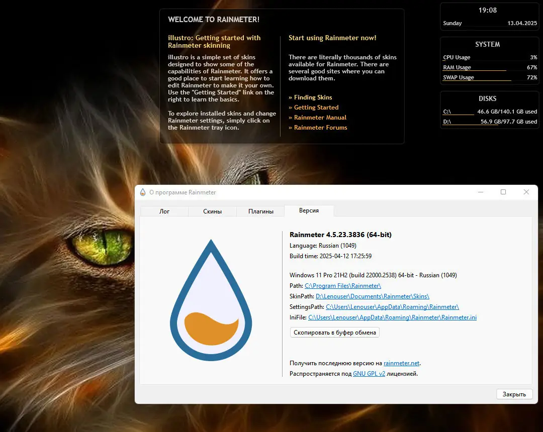Rainmeter — это программное обеспечение для мониторинга производительности системы и персонализации рабочего стола в операционной системе Windows. Утилита отображает ключевые параметры компьютера: загрузку процессора, объём оперативной и виртуальной памяти, состояние дискового пространства, сетевую активность, включая скорость передачи данных и IP-адрес. Кроме того, Rainmeter поддерживает интеграцию с внешними источниками, такими как прогноз погоды и ленты новостей, а также позволяет использовать разнообразные скины для визуального оформления интерфейса.