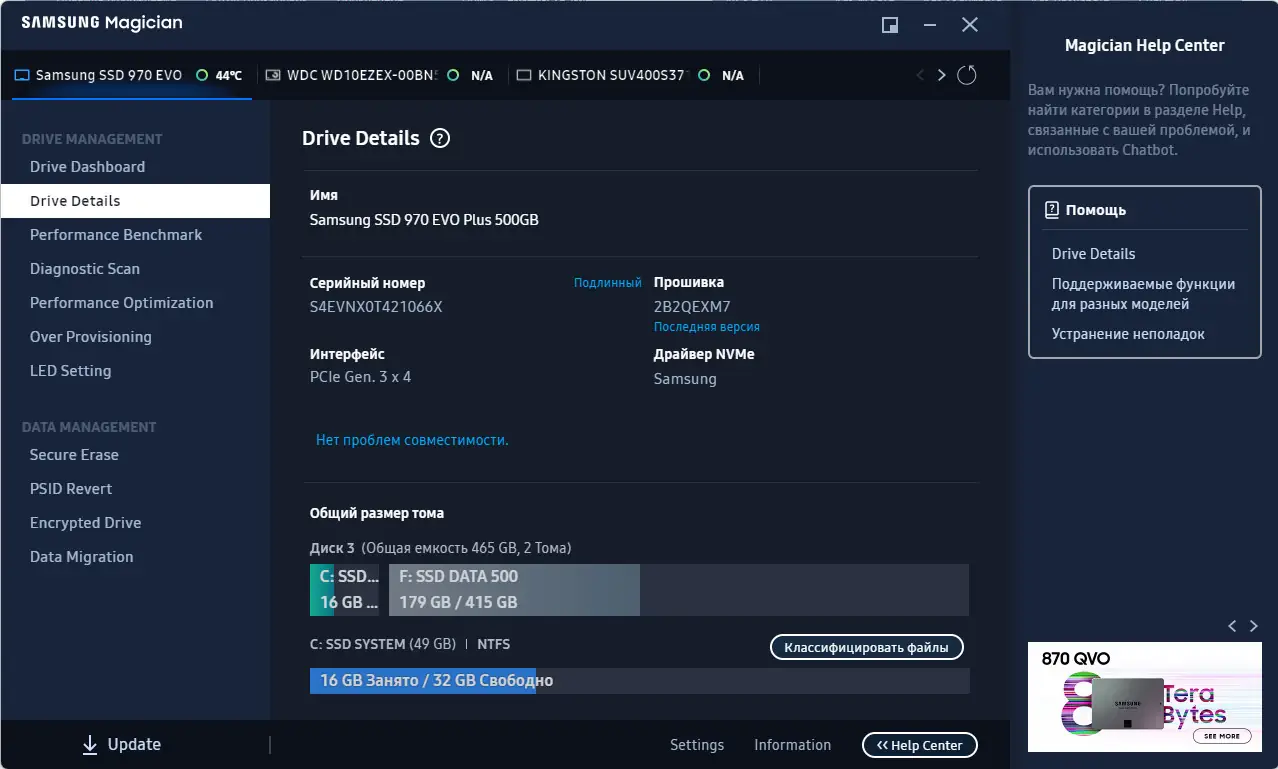Программа Samsung SSD Magician разработана для комплексного управления твердотельными накопителями компании Samsung. Она позволяет в режиме реального времени отслеживать ключевые параметры диска, такие как температура, оставшийся ресурс, производительность и статус S.M.A.R.T. Пользователи могут получать уведомления о потенциальных сбоях и своевременно принимать меры для предотвращения потери данных. Программное обеспечение поддерживает широкий спектр моделей SSD, включая как внутренние, так и портативные устройства.