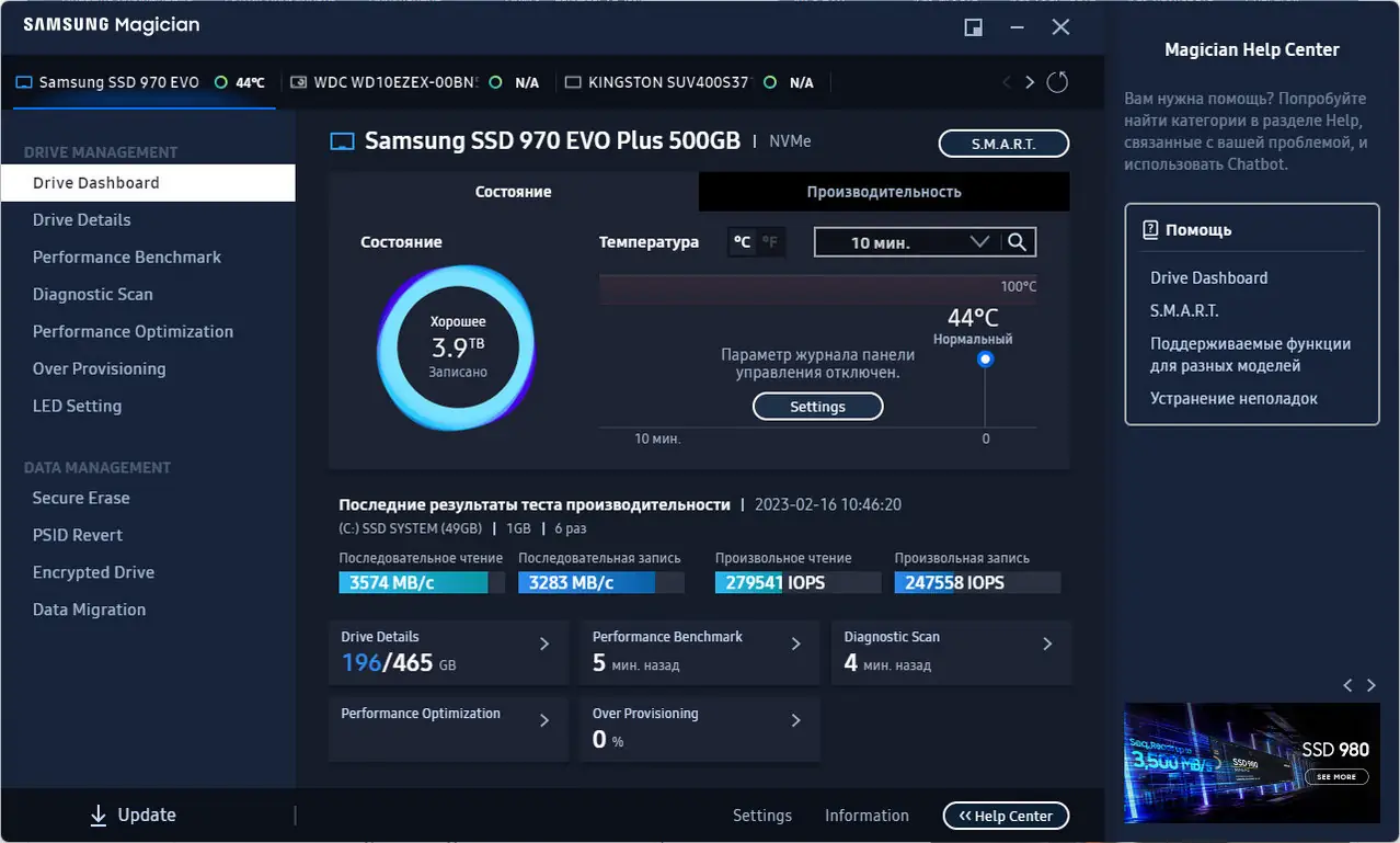 Samsung SSD Magician — это специализированное программное обеспечение для мониторинга, диагностики и оптимизации твердотельных накопителей Samsung. Приложение предоставляет детальную информацию о состоянии диска, включая температуру, уровень износа, скорость чтения и записи, а также позволяет проводить тесты производительности и обновлять прошивку. Программа ориентирована на пользователей, стремящихся поддерживать SSD в идеальном состоянии и максимально использовать его ресурсы.