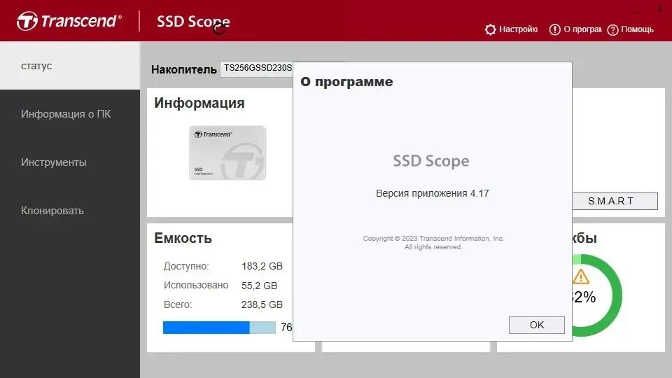 Transcend SSD Scope — это специализированное приложение для диагностики, мониторинга и обслуживания твердотельных накопителей от компании Transcend. Программа предоставляет детальную информацию о состоянии диска, включая уровень износа, скорость чтения и записи, а также данные S.M.A.R.T. Инструменты оптимизации, безопасного удаления и клонирования помогают продлить ресурс SSD и упростить его замену.