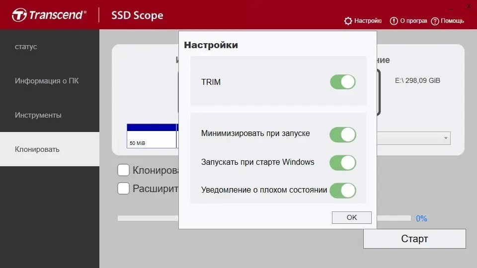 - Включает функцию TRIM для поддержания стабильной скорости работы диска
