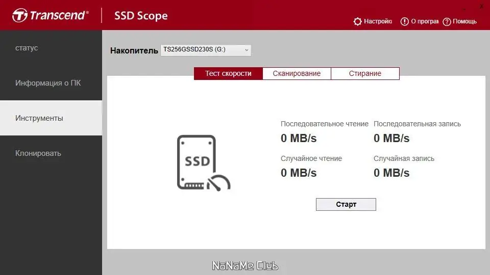 Интерфейс Transcend SSD Scope интуитивно понятен и не требует глубоких технических знаний. После запуска приложение автоматически определяет подключённые SSD накопители Transcend и отображает их основные характеристики. Пользователь может перейти к тестированию производительности, запустив замер скорости последовательного и случайного доступа.
