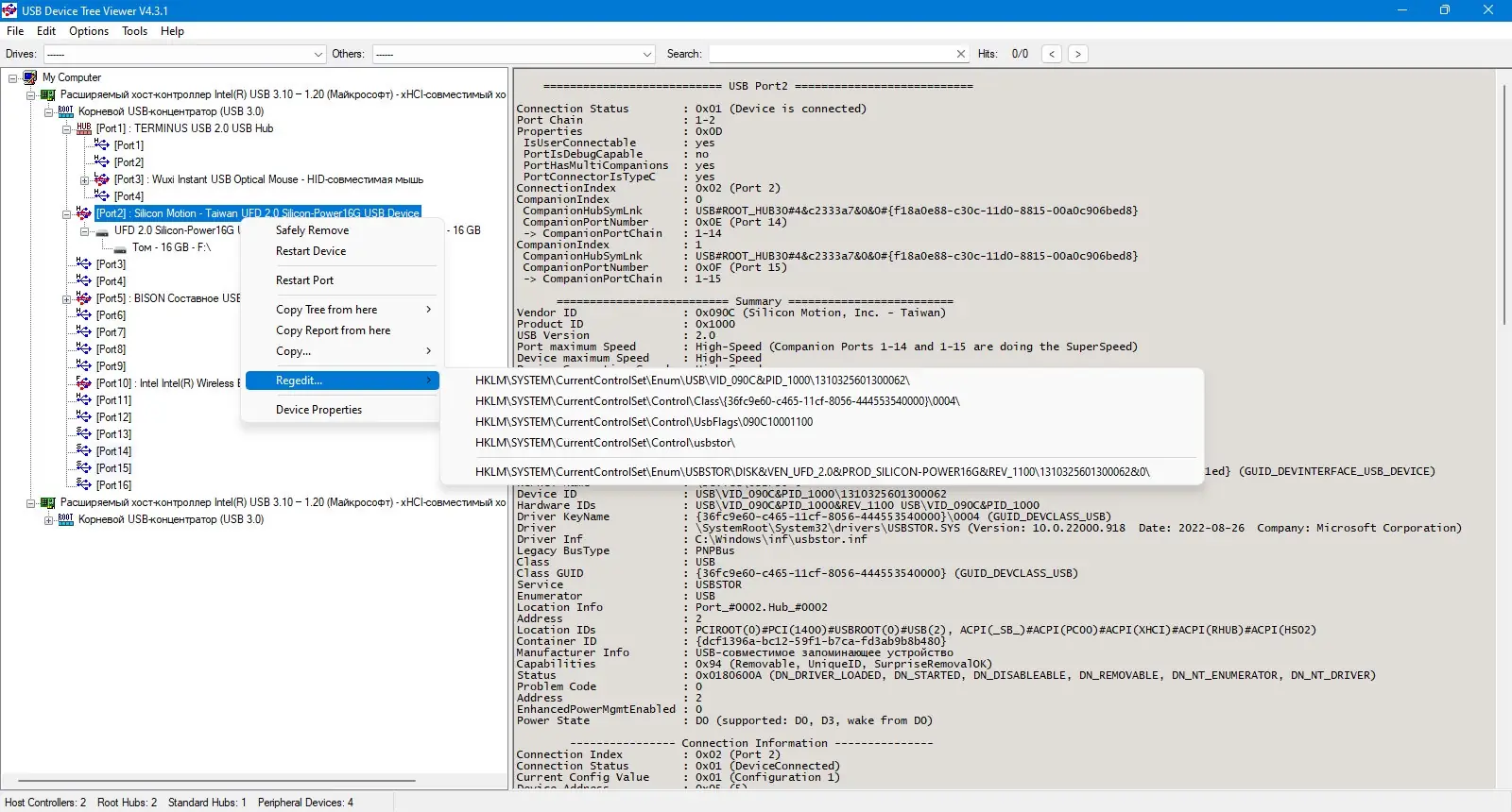 - Отображение USB-иерархии в виде раскрываемого дерева с иконками и цветовой индикацией