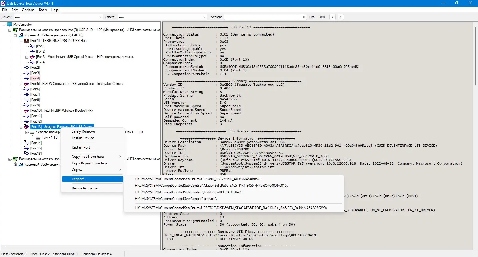 Использование USB Device Tree Viewer не требует установки — это портативное приложение, запускаемое напрямую. После старта программа автоматически сканирует все USB-контроллеры и строит иерархическое дерево устройств. Пользователь может раскрывать узлы, чтобы увидеть вложенные хабы и подключённые гаджеты. При выборе элемента в правой панели отображается подробная информация, включая технические дескрипторы, параметры питания и идентификаторы. Через контекстное меню доступны действия: безопасное извлечение, перезапуск устройства, вызов стандартного окна свойств или открытие соответствующего раздела реестра. Для быстрого поиска используется панель переходов и сочетания клавиш, например, Alt+D открывает список дисков. Также можно копировать текст отчёта, сохранять данные в XML или экспортировать полный скриншот дерева в буфер обмена.