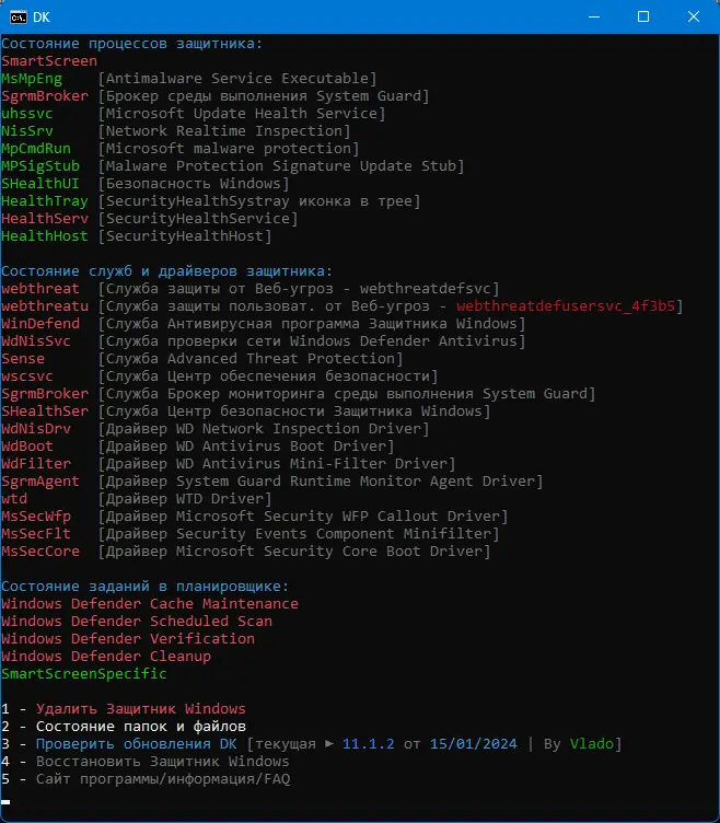 - Полное удаление компонентов Windows Defender, включая SmartScreen и фоновые службы.