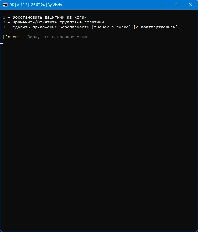 Для корректной работы DefenderKiller в 32-битных системах необходимо заменить два файла в папке Work — nircmd.exe и nsudolc.exe — на соответствующие версии для x86. Запуск осуществляется от имени администратора, после чего пользователь получает доступ к основному интерфейсу с набором действий. Выбирая нужную опцию, можно отключить службы, удалить процессы или вернуть систему к начальному состоянию.