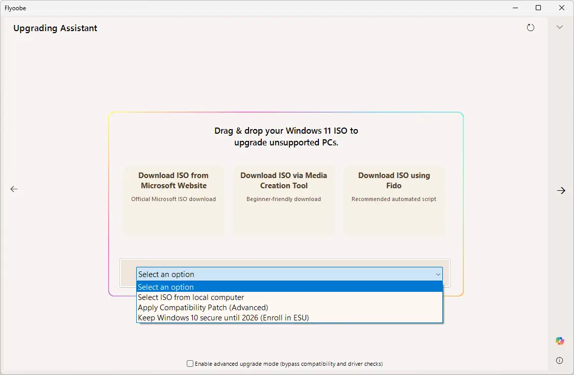 Flyoobe — это усовершенствованное решение для установки Windows 11 (24H2) на неподдерживаемое оборудование, снятое с ограничений, навязанных производителем. Программа заменяет собой ранее популярный инструмент flyby11, развивая его концепцию в полноценную платформу первоначальной настройки системы. Она не только обходит проверки совместимости, но и предоставляет расширенный интерфейс OOBE для гибкой настройки системы с первого запуска.