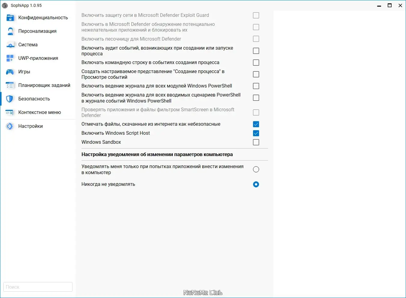 Программа сочетает в себе мощь профессионального твикера и безопасность, основанную на использовании только легальных методов изменения системы. SophiApp компилируется в облаке с помощью GitHub Actions, а каждый релиз сопровождается хэш-суммами, которые можно проверить в логах сборки. Это исключает возможность подмены файлов и повышает доверие к дистрибутиву. Код регулярно проходит проверку с помощью статического анализатора PVS-Studio, что способствует высокому качеству и отсутствию критических ошибок.