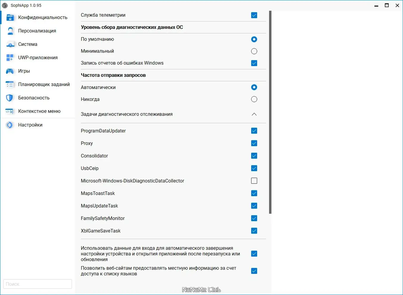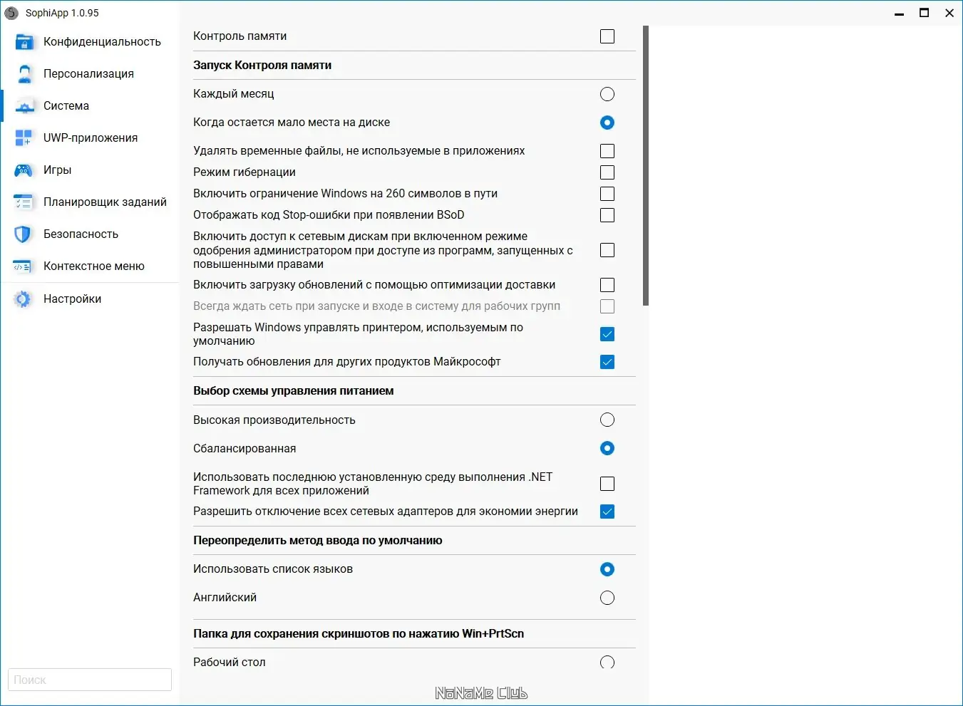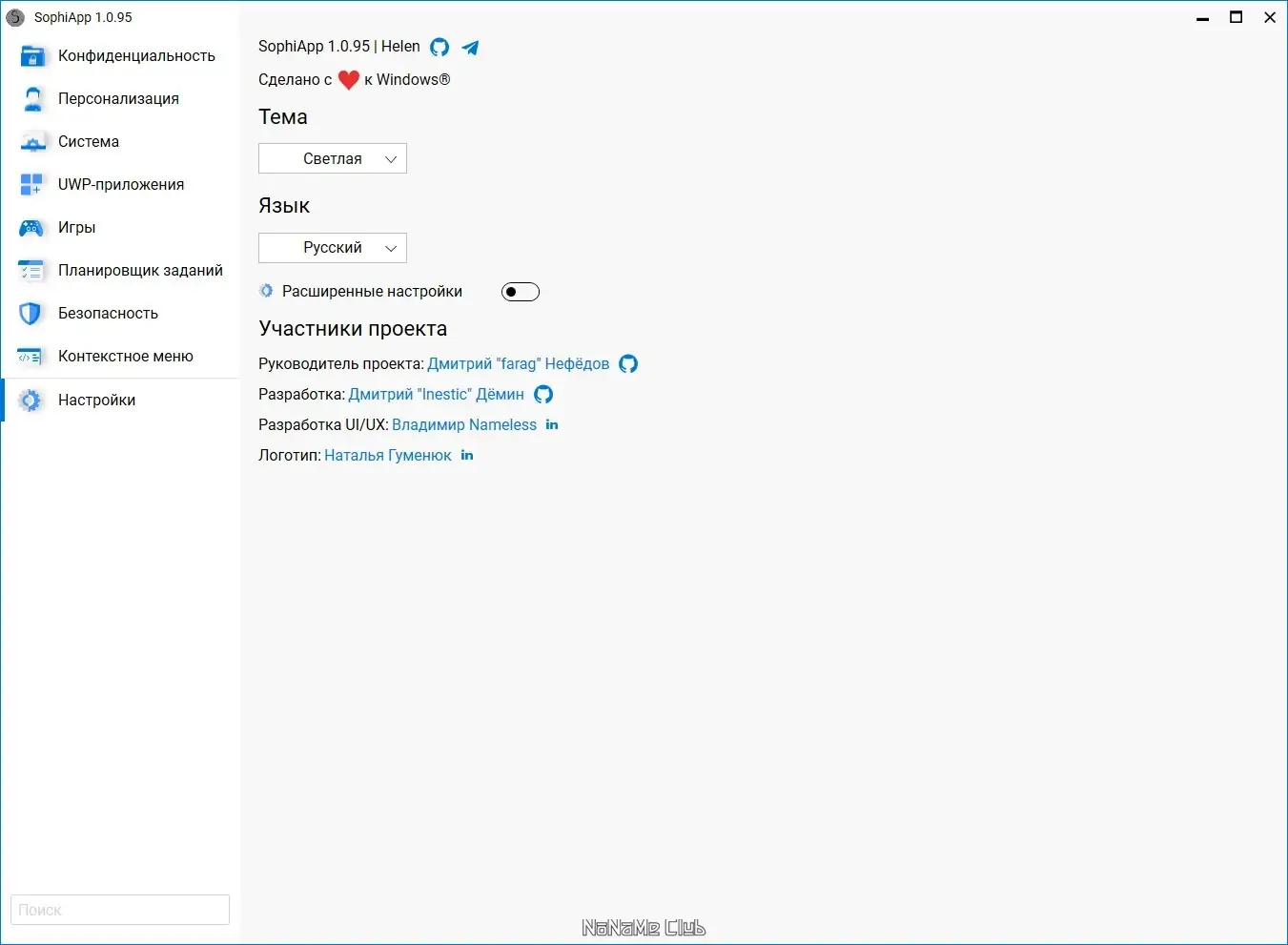 SophiApp представляет собой бесплатное приложение с открытым исходным кодом, ориентированное на пользователей, стремящихся к полному контролю над своей операционной системой. Интерфейс построен по паттерну MVVM, что обеспечивает гибкость и масштабируемость. Программа поддерживает динамическое отображение элементов, включая UWP-приложения с локализованными названиями и иконками, без использования захардкоженных значений. Это позволяет адаптироваться к различным языкам и конфигурациям Windows.